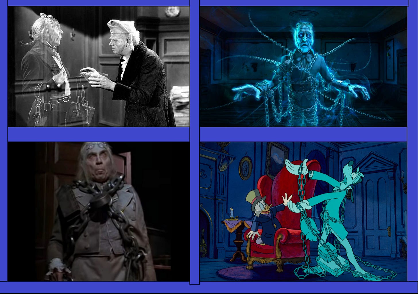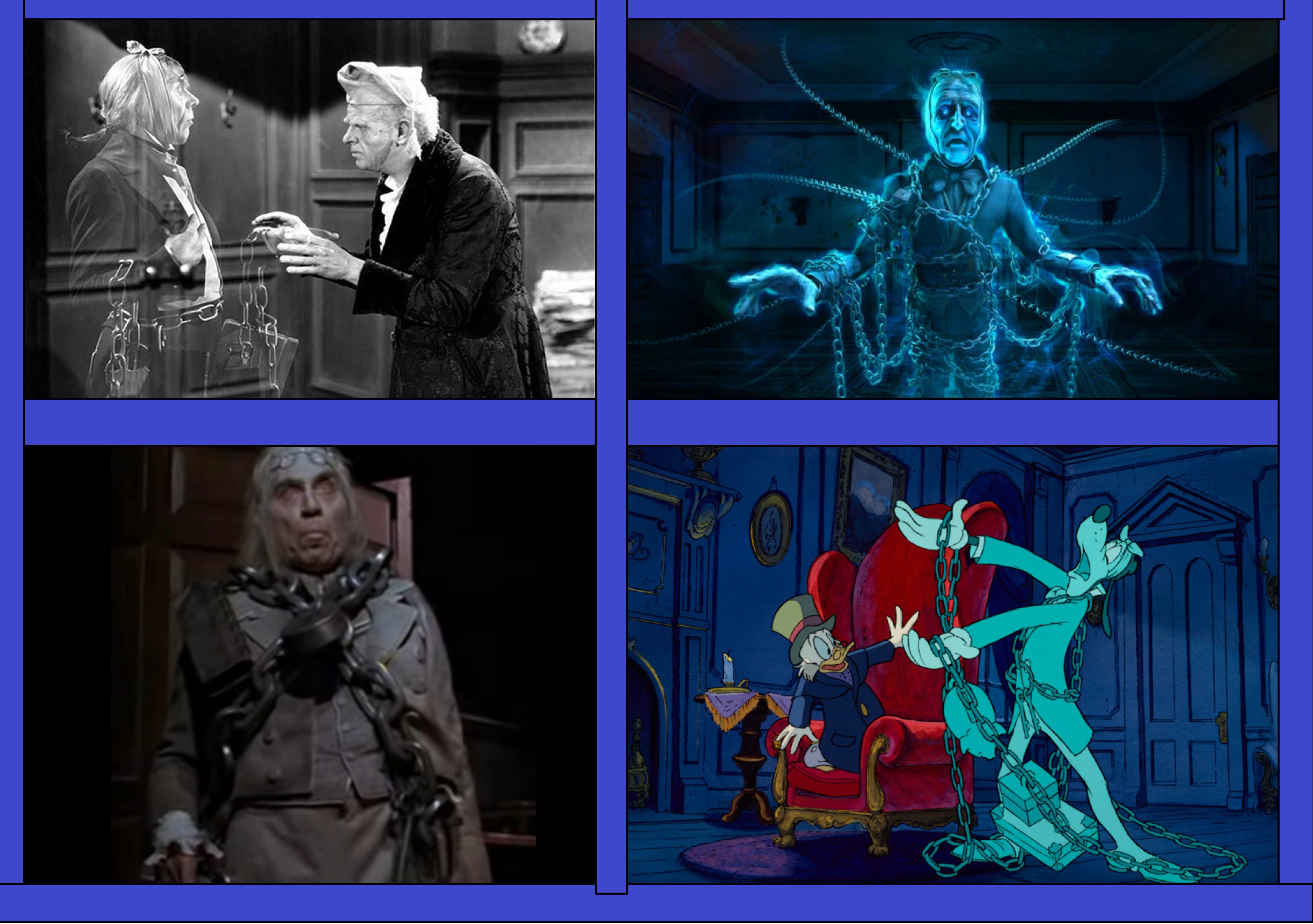 This imagery you have almost surely seen on tv or in movies at some point. Not only has Christmas Carol been remade countless times, but the chained-up ghost has seen plenty of adoption in other media as well. Just a few of the Marley ghost iterations can be seen below.