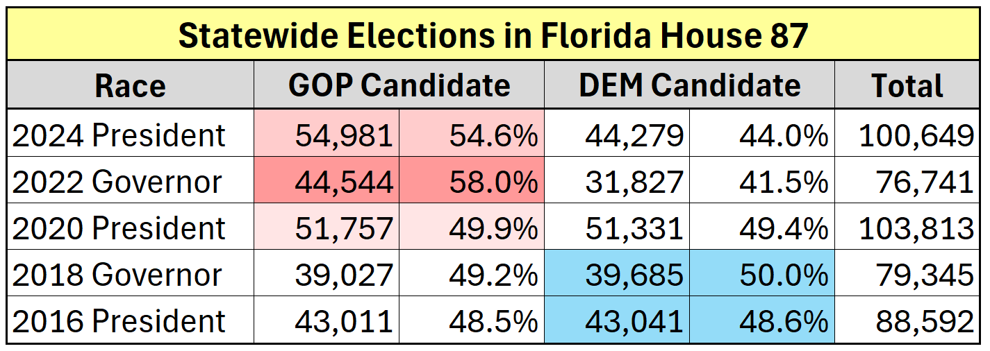 While all three of these seats voted for Trump in 2024, none are as deeply red as many of the districts that held special elections in Florida last year. Senate District 14 was a Biden district in 2020 and House 87 was a virtual tie that same year.