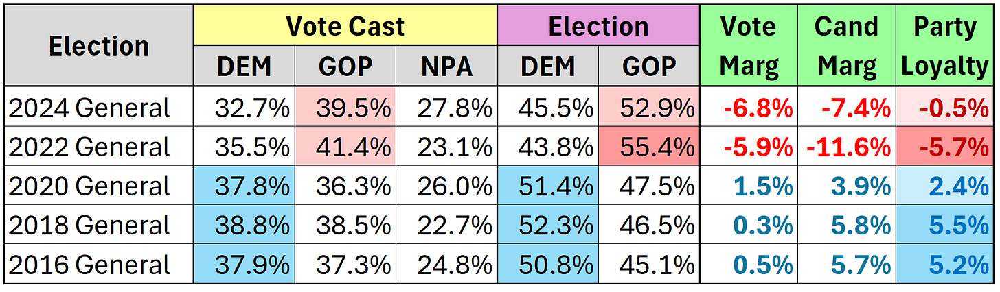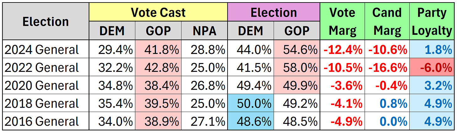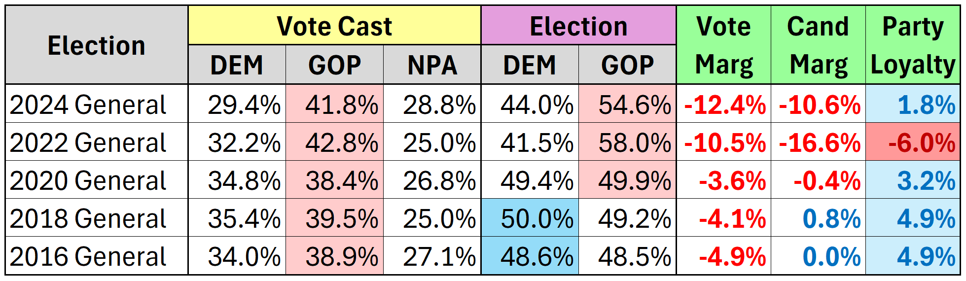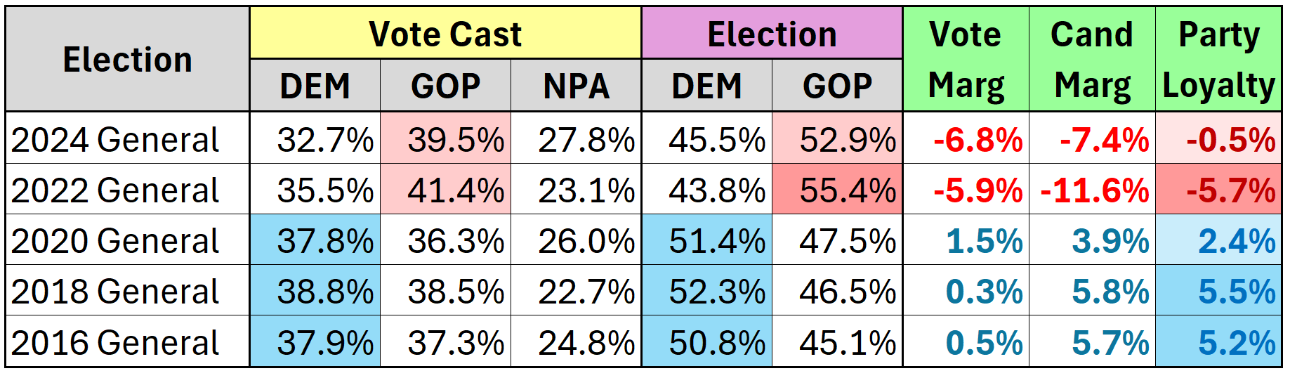 Democrats will want to come in at least with a final vote cast that is no higher than 2024’s 6.6% lead; hoping that a NPA swing to the left (and Hispanic democrats coming home) can propel an upset win.