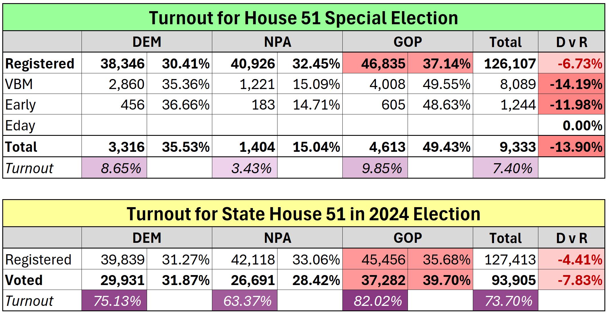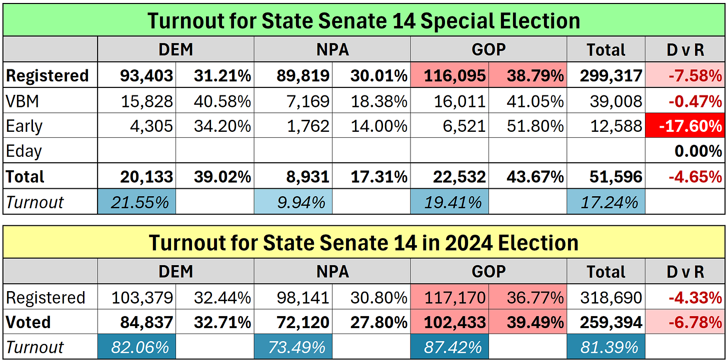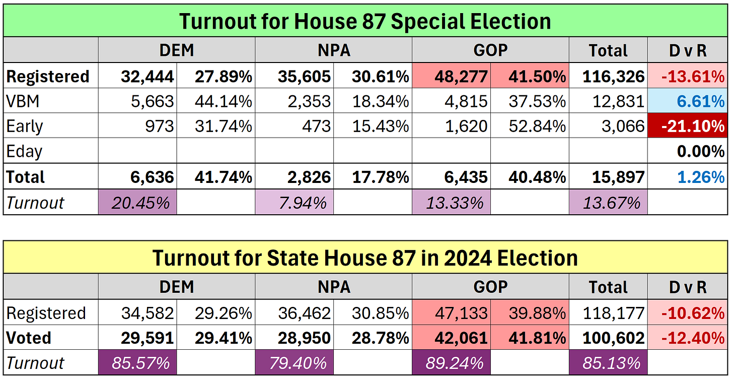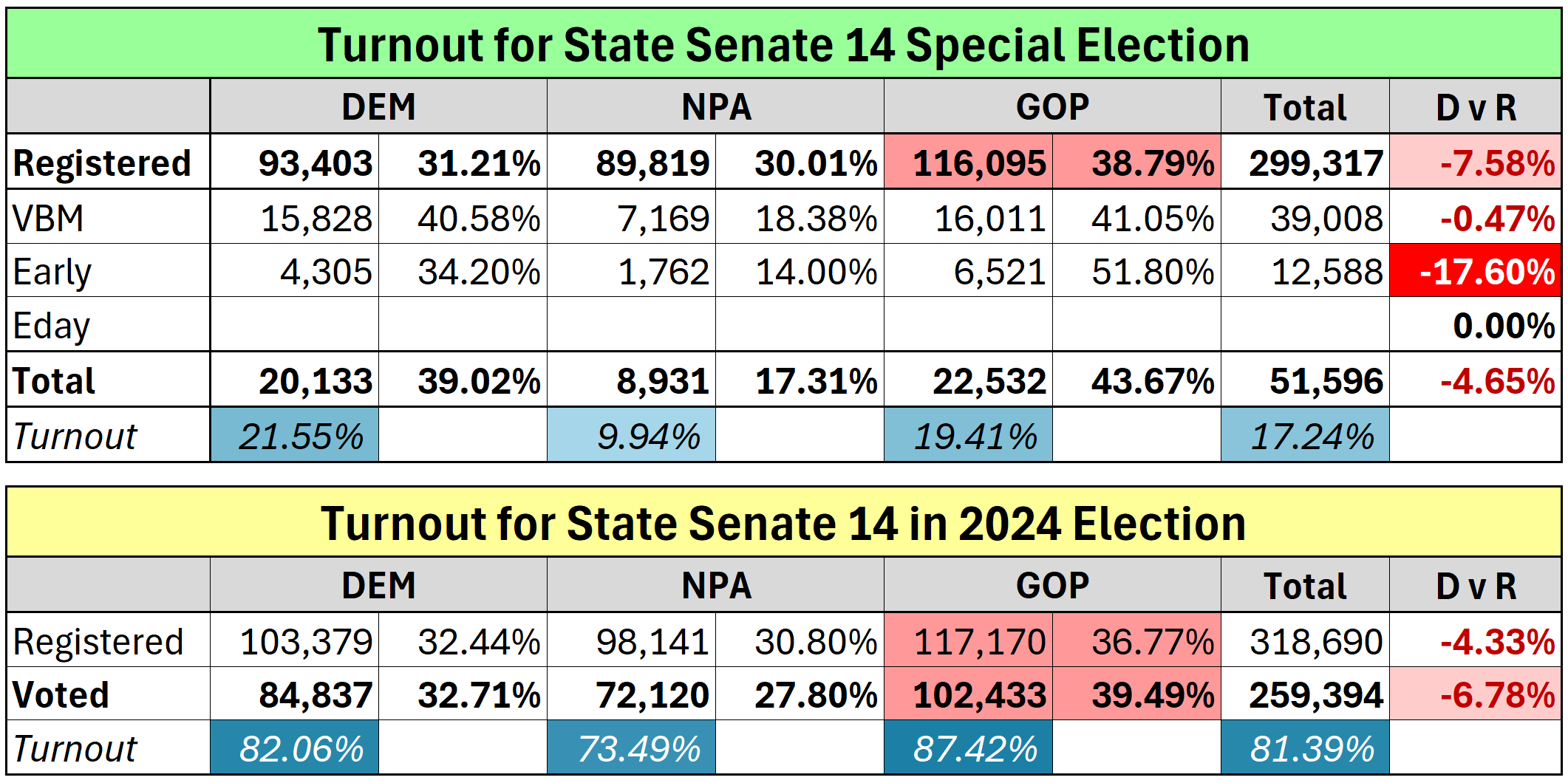 Democrats will want to come in at least with a final vote cast that is no higher than 2024’s 6.6% lead; hoping that a NPA swing to the left (and Hispanic democrats coming home) can propel an upset win.