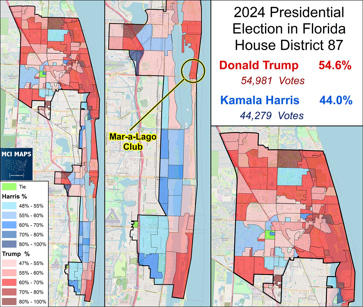 Next up for discussion is the special election being held down in Palm Beach County. Of all three seats up, this is the district that Democrats have expressed the most optimism about potentially flipping. The coastal district goes from the Jupiter region in the north and stretches down into Lake Worth. Its shape is dictated by a neighboring Black-access seat that includes much of West Palm Beach. By looping around the more racially diverse parts of the county, the district is 72% white. The seat backed Trump by 10 points in 2024. It is also notably home to Trump’s Mar-a-Lago resort.