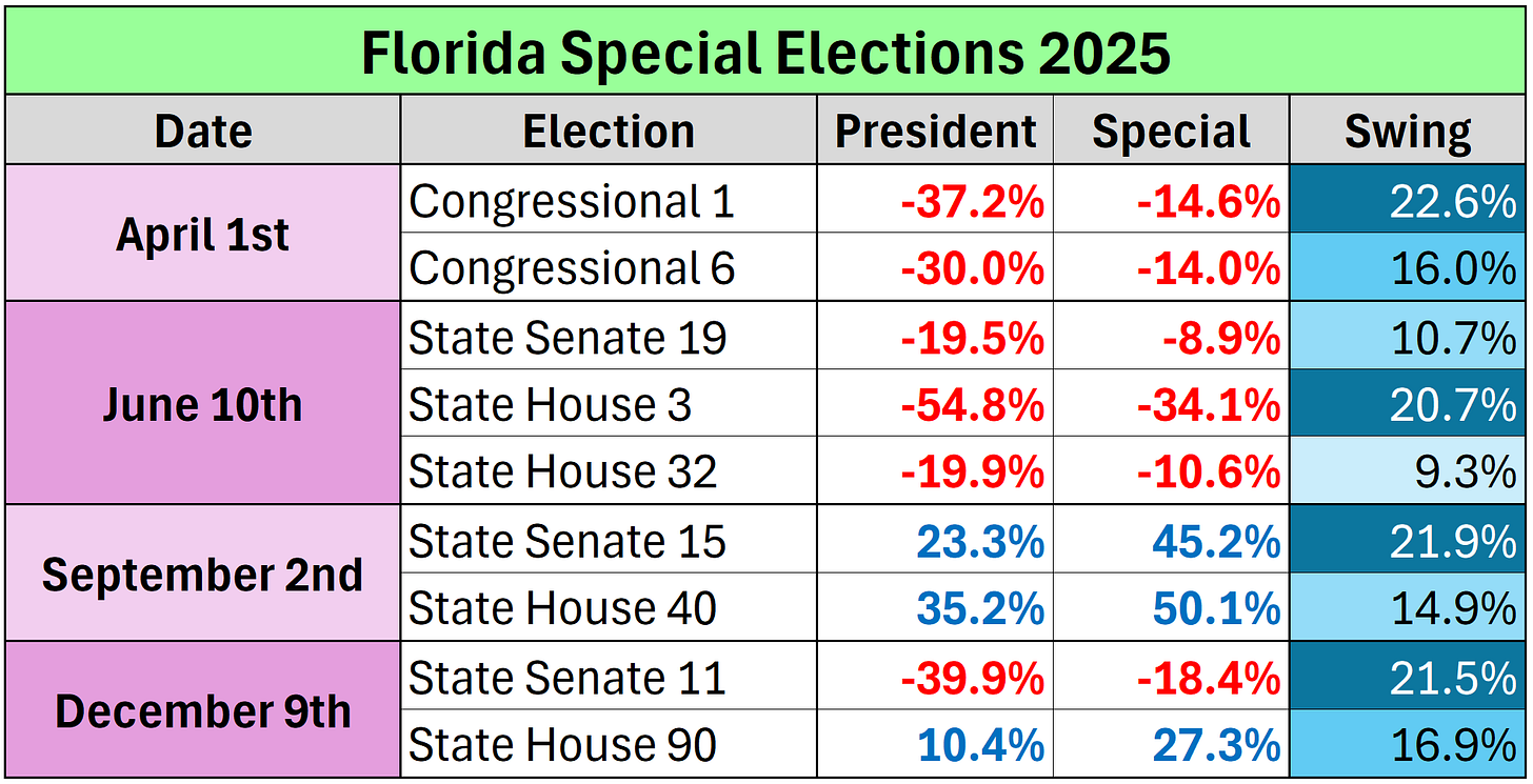 Thanks to registration issues, the electorate casting ballots in these specials is likely to be more Republican-leaning than 2020, and maybe even 2024. However, the 2025 special elections in Florida did give Democrats reason for hope. I discussed EVERY special election that Florida had in 2025 in this article deep dive here.