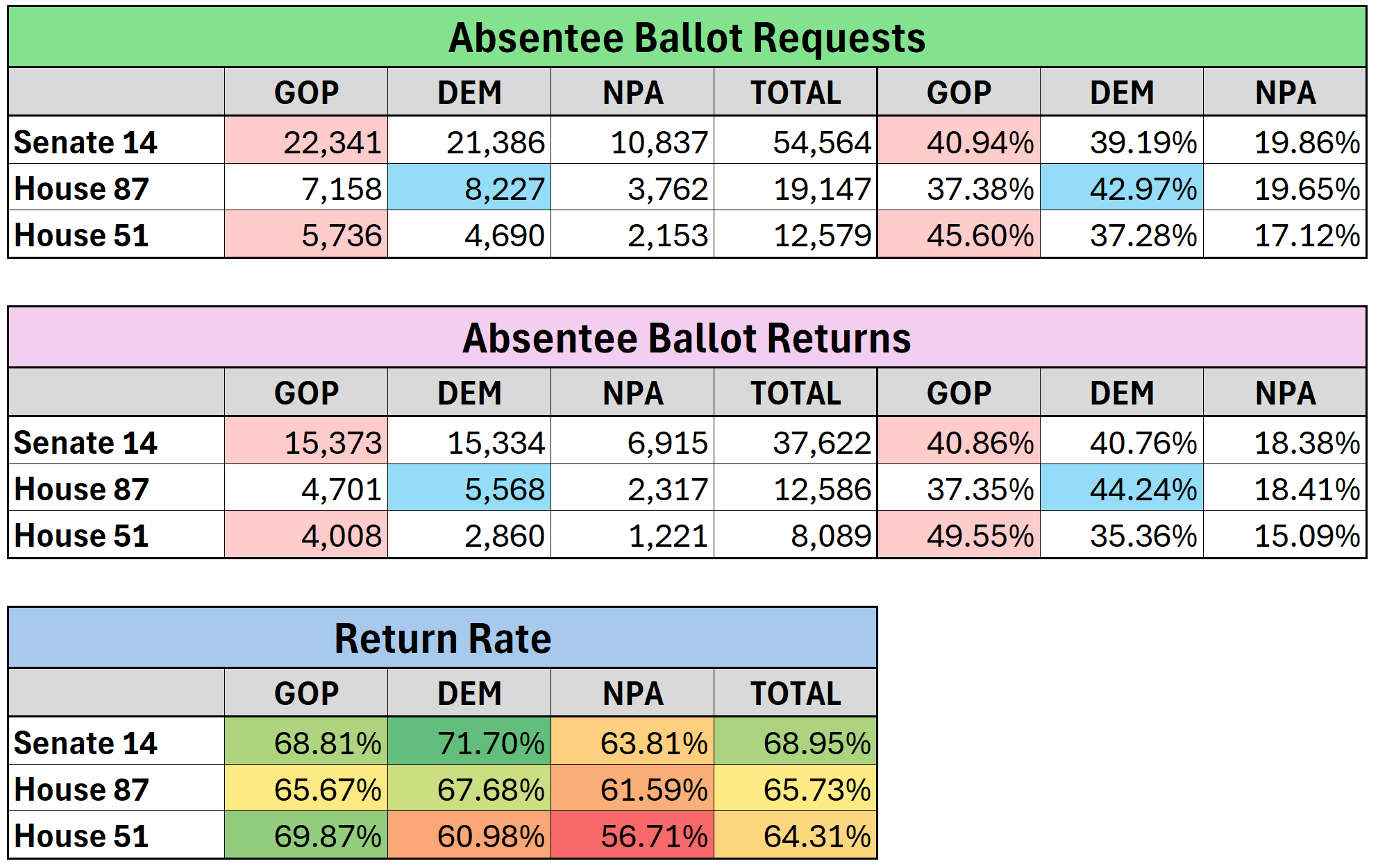 The result is that the current absentee roll is far less Democratic-heavy than in previous years, making comparisons with past elections much harder. Below is the absentee ballot requests and returns for the three legislative races up Tuesday.