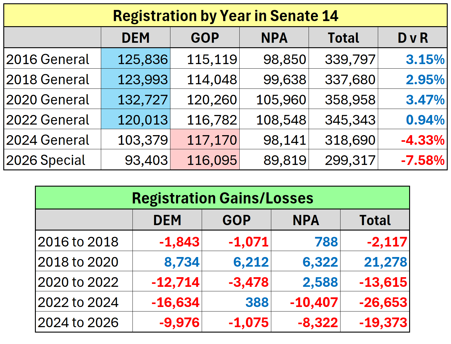 When Biden won the vote in SD14 back in 2020, the Democrats had a 3.5% voter registration lead. However, by the time we got to 2024, the Republicans had a lead of 4.3%. The shifts in registration have a strong correlation with the support candidates get in the elections; which you can see in the table below. It shows the Dem vs GOP margin in vote cast and how the President/Governor candidates got in the district. The gap between the two “party loyalty” never got past 6%.