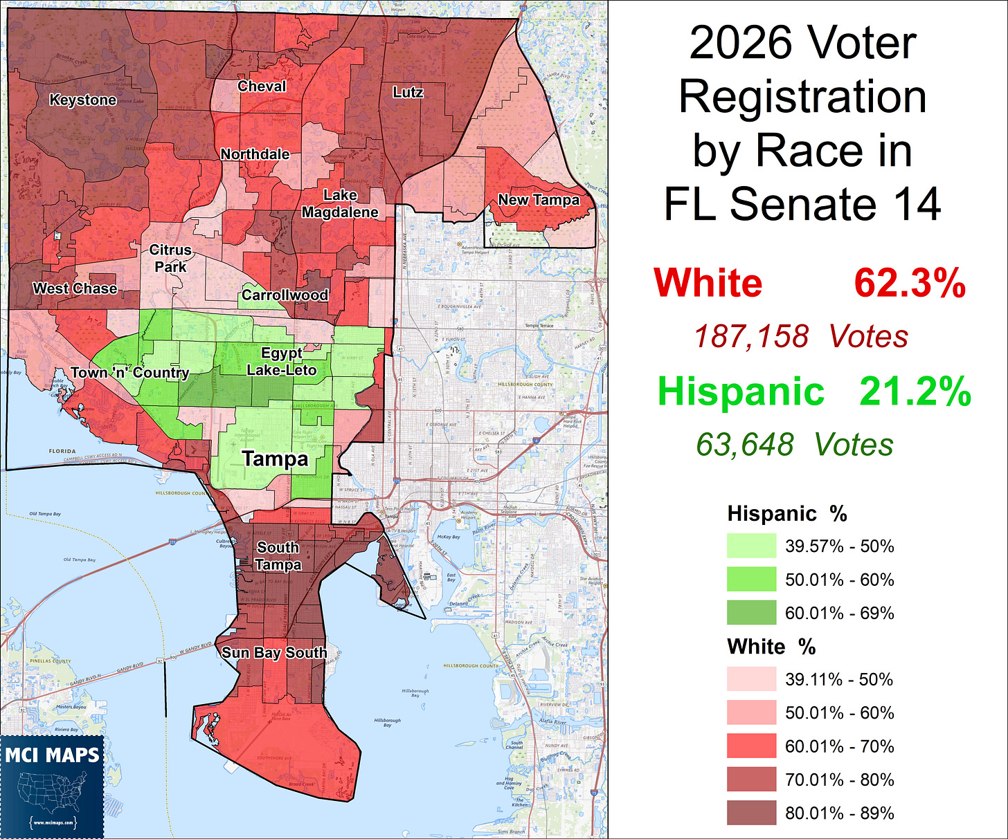 State Senate District 14 sits in western Hillsborough County, covering part of the City of Tampa. The district is majority-White, but has a sizable Hispanic community located in its Egypt Lake-Leto and Town n’ Country neighborhoods. In terms of voter registration, 21% of the district is Hispanic and 62% is white.