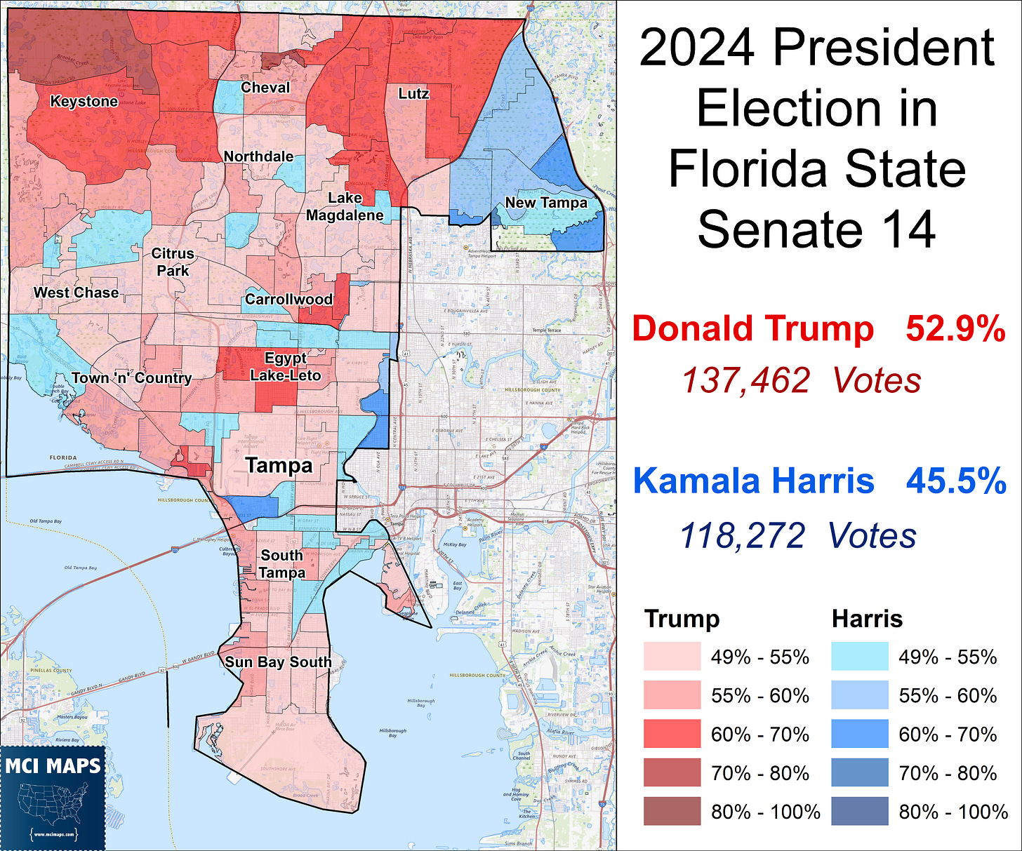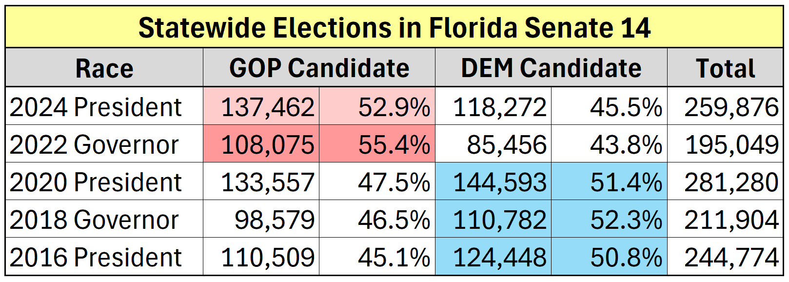 Trump’s win in Senate 14 came amid a bad round of elections of Hillsborough Democrats across the board. Their efforts to win back the State Attorney post came up empty, as well as efforts to win several countywide posts. Shortly after the 2024 election, Democratic State House member Susan Valdes, who represented the majority-Hispanic HD64 that lied in the heart of the district, switched parties. This came as her district went from being Biden +16 to Trump +3.
