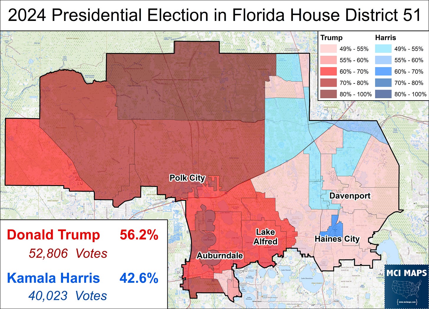 The 2024 election, however, saw a sizeable swing to the right; with Trump taking the district by 13.6%. Trump further consolidated rural white voters and won over many of the Puerto Rican community; who found affordability their main issue in the election. I covered the swing of Puerto Rican voters in my piece on neighboring Osceola County. You can read that post here.