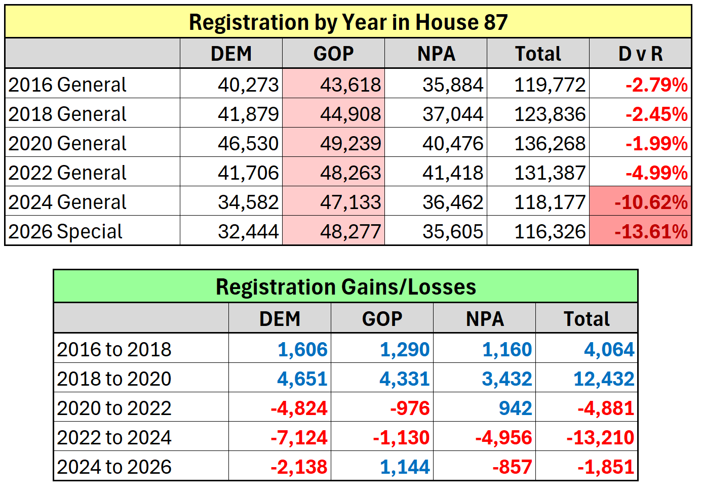 We will see how these races shake out on Tuesday. If Democrats fail to flip any race, or come flip HD87 but come painfully close in SD14, then alot of attention needs to turn to the voter registration dynamics. To me, the registration shifts in each district is a sign of a growing problem. Districts once much closer in 2020 are no longer easy to win because the electoral pool is redder than ever before.