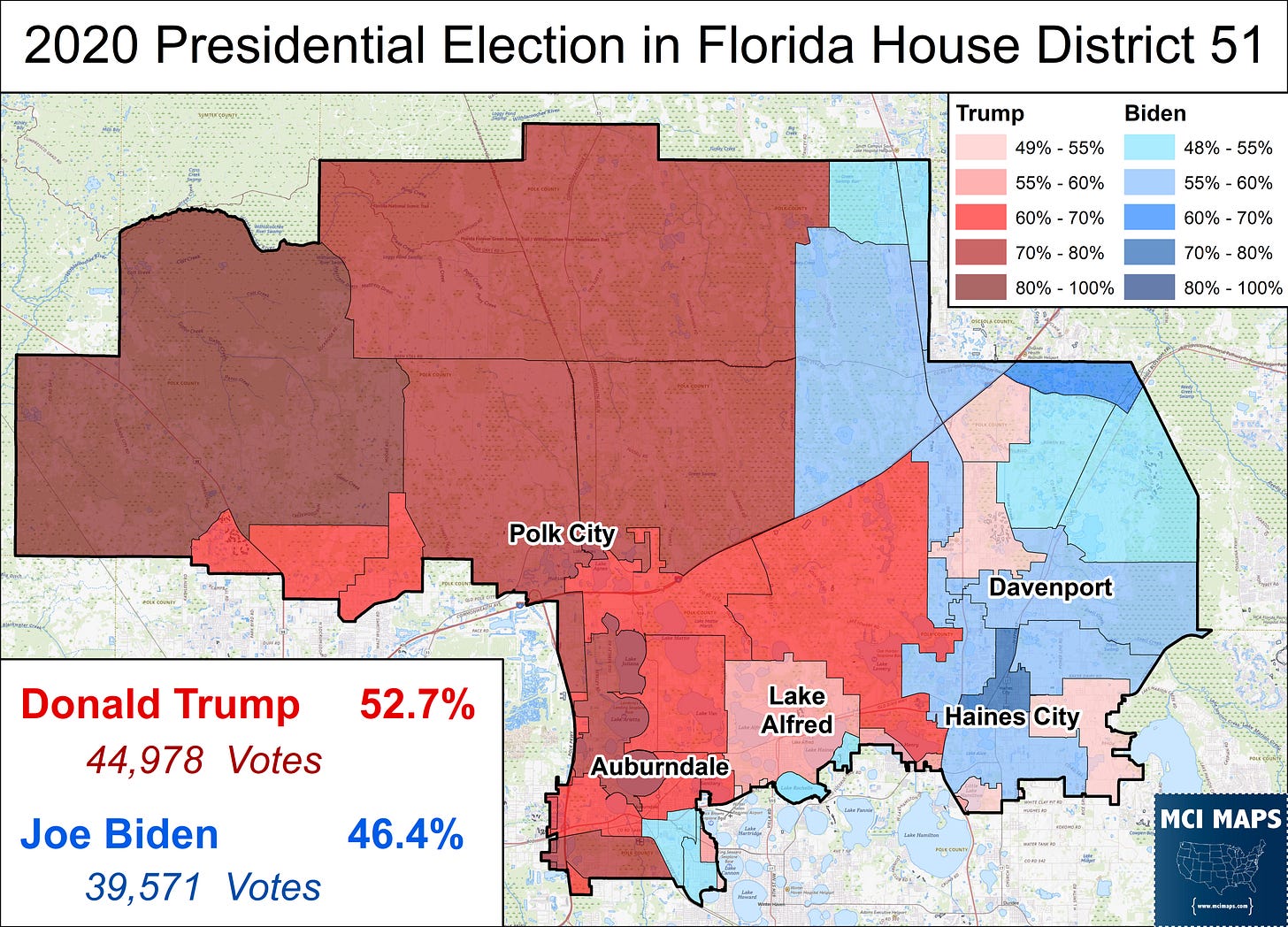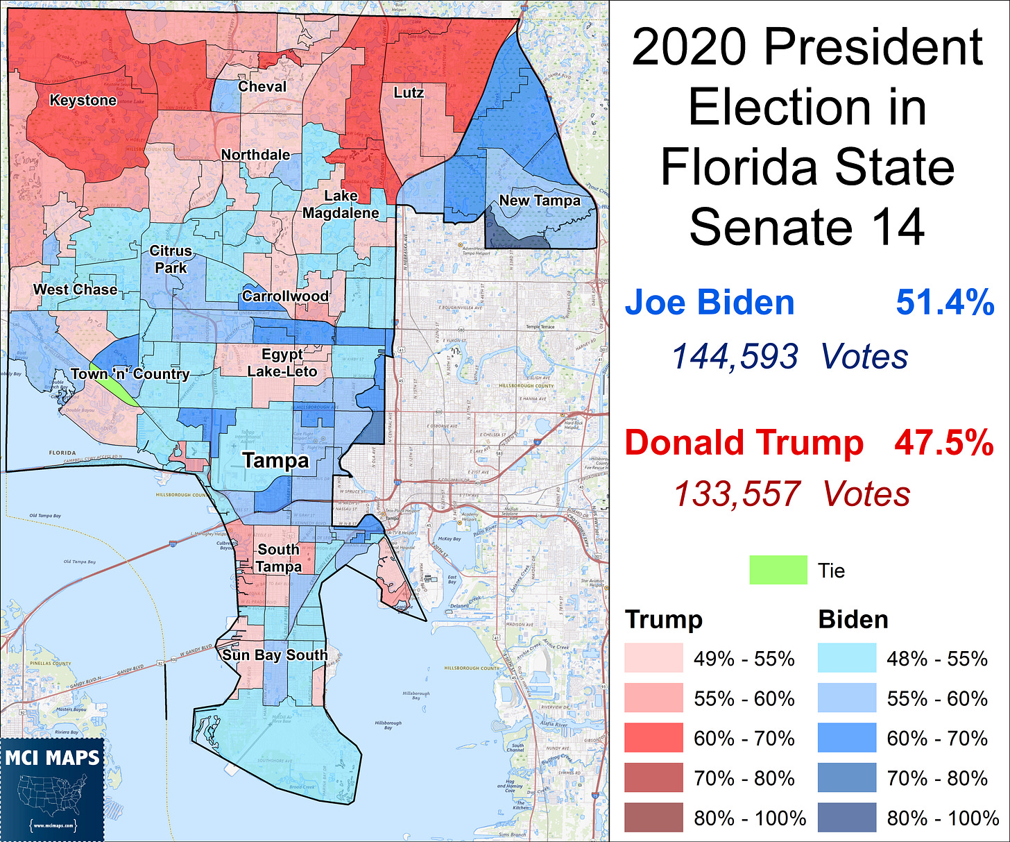 Historically this district leaned Democratic. Increasing Democratic strength in the suburbs and upper-income “South Tampa” region allowed both Hillary Clinton and Joe Biden to win the district. Biden won the district by 4% in the 2020 election; losing ground with the Hispanic community, namely losing the Egypt Lake-Leto area, but holding strong in the white suburbs.