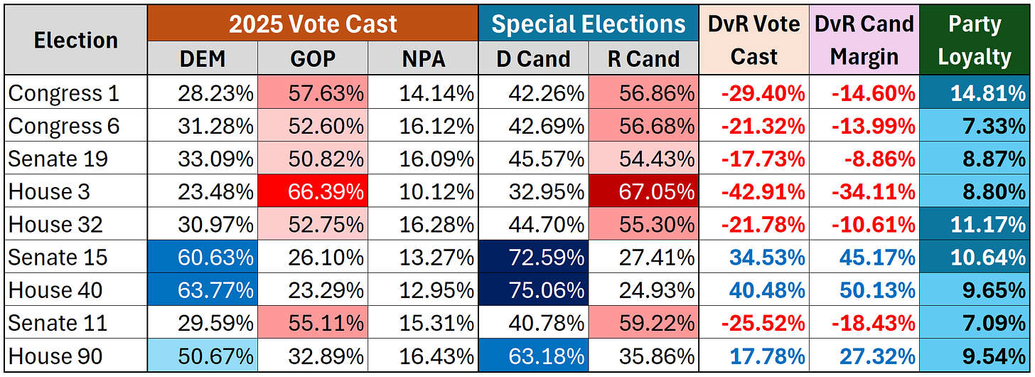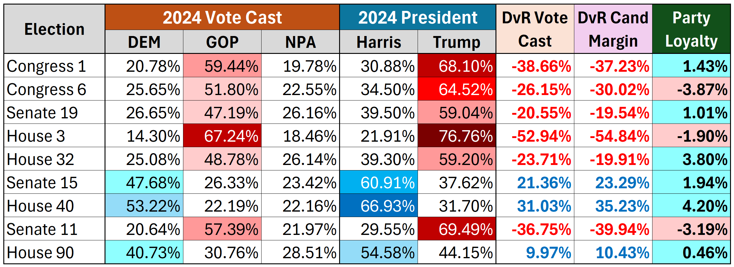 These strong over-performances mean the Democratic candidates easily won NPA voters and likely siphoned off batches of Republicans as well. Compare the “Party Loyalty” metric for the same districts in the 2024 Presidential election, and you see much closer scores. It highlights how much strong the special elections were in out-performing party metrics.